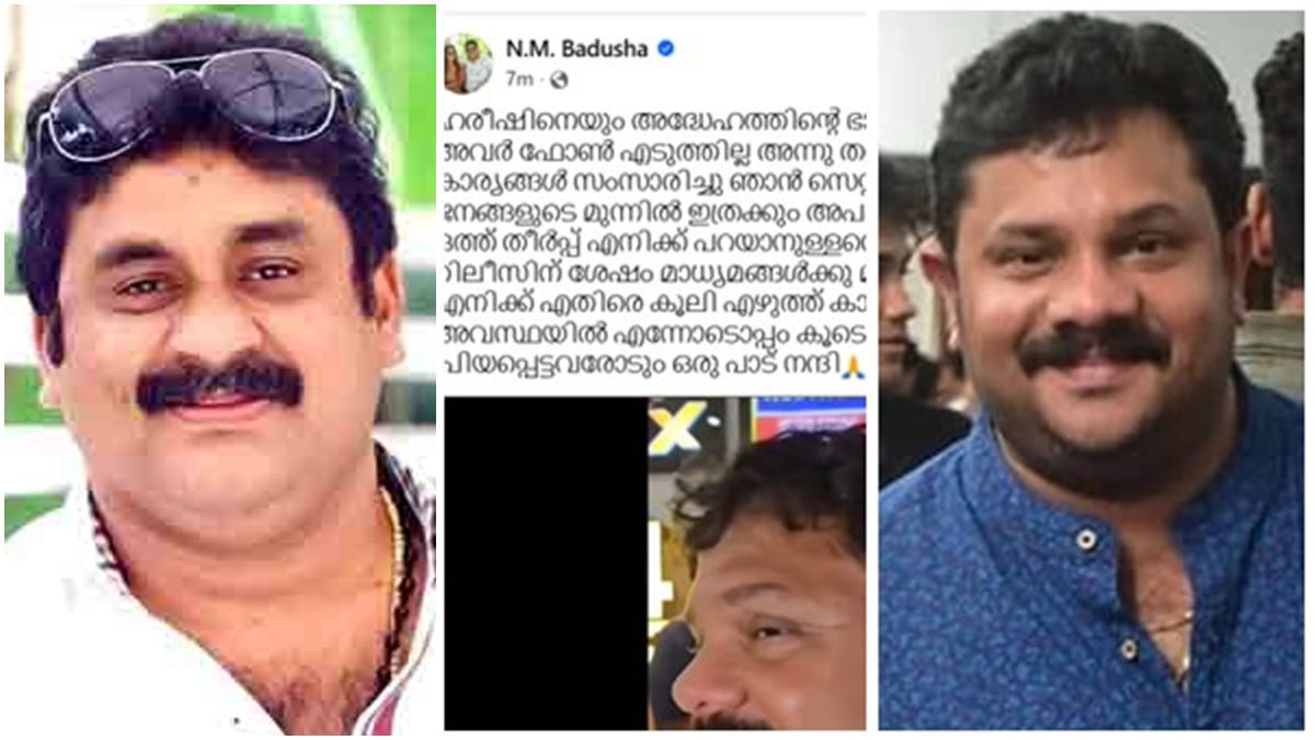 ''ബാദുക്കയുമായി വിളിച്ച് സംസാരിച്ചു. മൂപ്പര് സെറ്റില് ആക്കാമെന്ന് പറഞ്ഞു. ചെറിയ വിഷയത്തിലാണ്. അതു കഴിഞ്ഞാല് സെറ്റ് ചെയ്യാമെന്ന് പറഞ്ഞിട്ടുണ്ട്. ഒക്കെ ഒരു സമയദോഷം. അതുകൊണ്ടായിരിക്കും'' എന്നായിരുന്നു ഹരീഷിന്റെ പ്രതികരണം. ഹരീഷ് ഇക്കാര്യം പറയുന്ന വീഡിയോ പങ്കുവച്ചാണ് എന്എം ബാദുഷ ഇപ്പോള് ഫേസ്ബുക്കില് കുറിപ്പ് എഴുതിയിരിക്കുന്നത്.
