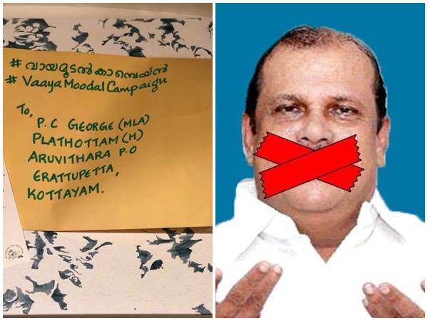 പിസി ജോര്ജ്ജിന്റെ വായ മൂടാന് സെല്ലോ ടേപ്പുകള് അയക്കുകയാണ് മലയാളികള്. സെല്ലോ ടേപ്പ് അയക്കുന്ന കവറിന് പുറത്ത് 'വായ മൂടെടാ പിസി' എന്ന് മലയാളത്തിലും ഇംഗ്ലീഷിലും എഴുചിക്കൊണ്ടാണ് അയക്കുന്നത്. ഫേസ്ബുക്കിലാണ് ഇത്തരം ഒരു കാമ്പയിന് തുടങ്ങിയിരിക്കുന്നത്.