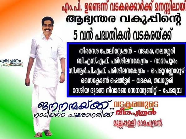 താങ്കള് വിജയിച്ച ശേഷം താങ്കള്ക്ക് മണ്ഡലത്തിന്റെ പലഭാഗത്തും കോണ്ഗ്രസ്സുകാര് സ്വീകരണം നല്കുകയുണ്ടായി. 2014 ന് മുമ്പ് പതിനഞ്ചാം ലോക്സഭയില് താങ്കള് വടകരയില് എംപിയും കേന്ദ്രത്തില് സഹമന്ത്രിയും ആയിരുന്നു. അന്തക്കാലത്ത് പെരുവണ്ണാമൂഴിയില് താങ്കള് സിആര്പിഎഫ് കേന്ദ്രത്തിന് തറക്കല്ലിടുകയും മണ്ഡലത്തിലെ പല സിആര്പിഎഫ്ജവാന്മാരുടെ കുടുംബക്കാരും താങ്കളെ വന്നുകാണുകയും പെരുവണ്ണാമൂഴിക്ക് ട്രാന്സ്ഫറിനായി സഹായിക്കാം എന്നുപറഞ്ഞ് അവരെ ആശ്വസിപ്പിച്ച് മടക്കി അയക്കുകയും ചെയ്തിരുന്നു.