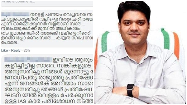 ചില പ്രതികരണങ്ങള് വായിക്കാം- 'നട്ടെല്ല് പണയം വെച്ചവരെ സമൂഹം ചവറ്റുകൊട്ടയിൽ വലിച്ചെറിഞ്ഞ ചരിത്രമേ ഉള്ളൂ എന്ന് ഓർമ്മിക്കുന്നത് നല്ലതാണ് സാർ.... നിലപാടുകൾക്ക് മുമ്പിൽ അധികാരം തടസ്സമാണെങ്കിൽ അതങ്ങ് വലിച്ചെറിഞ്ഞ് ഇറങ്ങിപ്പോ രണം സാർ.... കണ്ണൻ ഗോപിനാഥനെ പോലെ...'