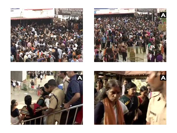 ഇരുമുടിക്കെട്ടില്ലാതെ എത്തുന്ന സ്ത്രീകളെ നടപ്പന്തലിൽ തടയുന്നു. സ്ത്രീകളുടെ സംഘമാണ് ഇവരെ തടഞ്ഞ് തിരികെ അയക്കുന്നത്