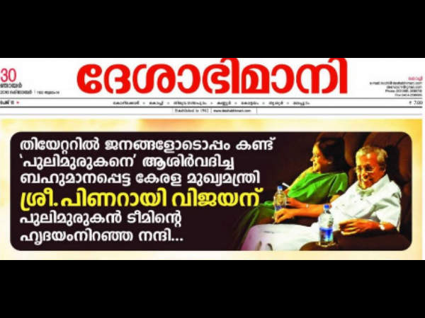 തിരുവനന്തപുരം: ദേശാഭിമാനി പത്രത്തിന്റെ ഒന്നാം പേജില് പുലിമുരുകന്റെ ഫുള് പേജ് പരസ്യം വന്നതാണ് ഇപ്പോഴത്തെ പ്രധാന ചര്ച്ച. വെറുതേ ഒരു ഫുള്പേജ് പരസ്യമാണെങ്കില് എല്ലാവരും അങ്ങ് സഹിച്ചേനെ. ഇതിപ്പോള് സംസ്ഥാന മുഖ്യമന്ത്രി പിണറായി വിജയനെ 'സുഖുിപ്പിച്ചുകൊണ്ട്' ഉള്ള പരസ്യമാണ്.