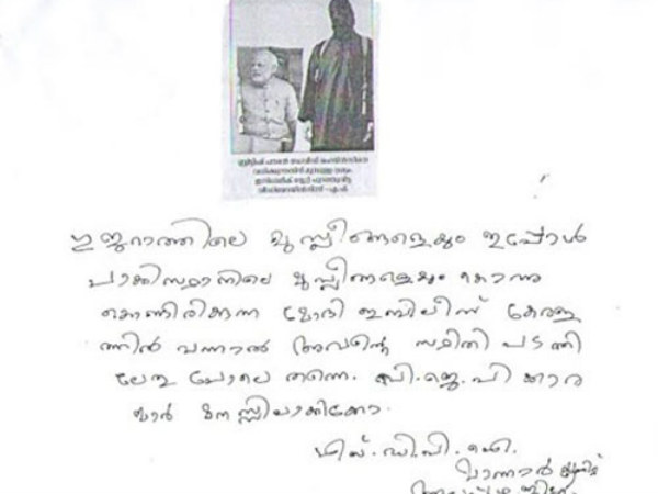 'ഗുജറാത്തിലെ മുസ്ലീങ്ങളെയും ഇപ്പോള് പാകിസ്താനിലെ മുസ്ലിങ്ങളെയും കൊന്നുകൊണ്ടിരിക്കുന്ന മോദി ഇബിലീസ് കേരളത്തില് വന്നാല് അവന്റെ സ്ഥിതി പടത്തിലേതു പോലെ തന്നെ, ബിജെപിക്കാരന്മാര് മനസിലാക്കിക്കോ' എന്നാണ് കത്തില് പറയുന്നത്.