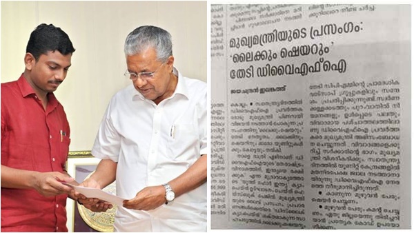 ഫേസ്ബുക്കിൽ ഡിസ്ലൈക്ക് ഓപ്ഷൻ ഉണ്ടെന്ന് കണ്ടുപിടിച്ച അങ്ങയുടെ ലേഖകനോടുള്ള കടപ്പാട് പറഞ്ഞറിയിക്കാൻ കഴിയുന്നതിലും അപ്പുറമാണ്.മറ്റൊരു ഉപകാരം കൂടി അങ്ങ് ഞങ്ങൾക്കായി ചെയ്തുതരണം. നാളത്തെ ഡി.വൈ.എഫ്.ഐ പരിപാടിയിൽ മുഖ്യമന്ത്രി സംസാരിക്കാൻ പോകുന്നതേതല്ലാം വിഷയങ്ങളിലാണെന്ന് കൃത്യമായി പത്രത്തിൽ എഴുതികണ്ടു.