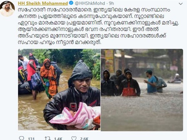 ദുബായി: പ്രളയക്കെടുതി രൂക്ഷമായ കേരളത്തെ സഹായിക്കാന് യുഎഇ വൈസ്പ്രസിഡന്റും പ്രധാനമന്ത്രിയും ദുബൈ ഭരണാധികാരിയുമായ ശൈഖ് മുഹമ്മദ് ബിന് റാഷിദ് അല് മക്തുമിന്റെ ആഹ്വാനം. വിഷയത്തില് മലയാളികളുടെ ശ്രദ്ധ കൂടുതല് ആവശ്യമായതിനാല് ഇംഗ്ലീഷിനും അറബിക്കും പുറമേ മലയാളത്തിലും ശൈഖ് മുഹമ്മദ് വിഷയം ട്വീറ്റ് ചെയ്തിട്ടുണ്ട്.