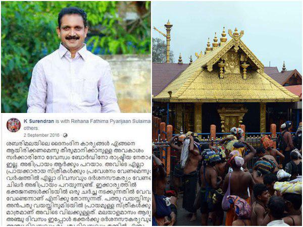 ആർത്തവം ഒരു പ്രകൃതി നിയമമല്ലേ? അതു നടക്കുന്നതു കൊണ്ട് മാത്രമല്ലേ ഈ പ്രകൃതിയിൽ മാനവജാതി നിലനിൽക്കുന്നത്? അതിനെ വിശുദ്ധമായി കാണണമെന്നാണ് എനിക്കു തോന്നുന്നത്. ഹിന്ദു സമൂഹം യുക്തിസഹമായ എന്തിനേയും കാലാകാലങ്ങളിൽ അംഗീകരിച്ചിട്ടുണ്ട്. സെമിററിക് മതങ്ങളിലേതുപോലുള്ള കടുംപിടുത്തം അത് ഒരിക്കലും കാണിക്കാറില്ല. ഇക്കാര്യങ്ങളെല്ലാം ഹൈന്ദവനേതൃത്വം പരിഗണിച്ചു മാററങ്ങളെ സ്വാഗതം ചെയ്യുമെന്നാണ് എനിക്കുതോന്നുന്നത് എന്നായിരുന്നു 2016 സെപ്റ്റംബർ 2 ന് കെ സുരേന്ദ്രൻ ഫേസ്ബുക്ക് പേജിൽ കുറിച്ചത്.