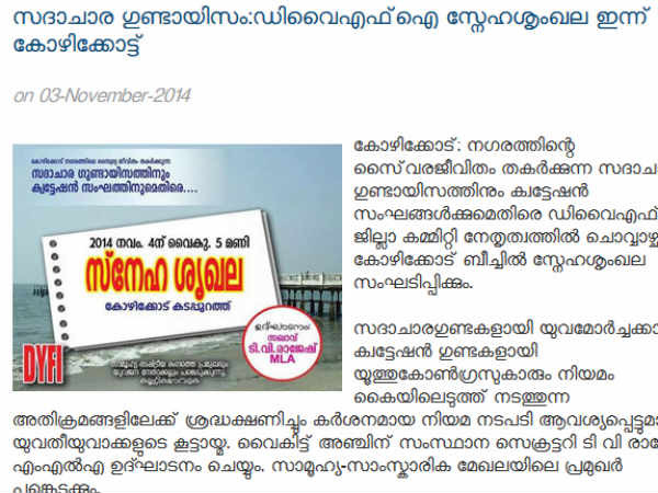 സദാചാര പോലീസിനെതിരെയാണ് ഡിവൈഎഫ്ഐയുടെ പ്രതിഷേധ കൂട്ടായ്മ. നവംബര് 4 ന് വൈകീട്ട് കോഴിക്കോട് ബീച്ചില് വച്ചാണ് പരിപാടി. കിസ്സ് ഓഫ് ലവ് എന്ന പ്രതിഷേധ പരിപാടി എല്ലാവര്ക്കും പങ്കെടുക്കാവുന്ന ഒരു സമരമാര്ഗ്ഗമായിരുന്നില്ലെന്ന് ഡിവൈഎഫ്ഐക്കും അഭിപ്രായമുണ്ടായിരുന്നു.
