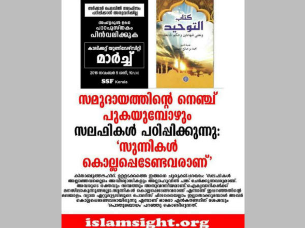 ഹിന്ദുത്വ ഫാസിസ്റ്റ് ശകതികള് മുസ്ലിം സമുദായത്തെ അക്രമിക്കുന്നതിന് സമാനമായാണ് സലഫിസ്റ്റുകള് സുന്നികളെ നേരിടുന്നതെന്നും, സര്ക്കാര് ചിലവില് സലഫിസം പ്രചരിപ്പിക്കുന്നതിനെതിരെയാണ് പ്രതിഷേധം സംഘടിപ്പിക്കുന്നതെന്നും എസ്എസ്എഫ് സംസ്ഥാന ജോയിന്റ് സെക്രട്ടറി മുഹമ്മദാലി കിനാലൂര് ഫെയ്സ്ബുക്ക് പോസ്റ്റില് പറയുന്നു. പുസ്തകത്തിലെ സുന്നി വിരുദ്ധ പരാമര്ശത്തിനെതിരെയും പാഠപുസ്തകം പിന്വലിക്കണമെന്നും ആവശ്യപ്പെട്ട് സര്വ്വകലാശാല മാര്ച്ചിനൊരുങ്ങുകയാണ് സുന്നി വിദ്യാര്ത്ഥി സംഘടനയായ എസ്എസ്എഫ്.