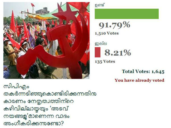 വണ് ഇന്ത്യ നടത്തിയ അഭിപ്രായ വോട്ടെടുപ്പില് 91.79 ശതമാനം പേരും പറയുന്നു സി പി എം തകര്ന്നടിഞ്ഞുകൊണ്ടിരിക്കുന്നതിന് കാരണം നേതൃത്വത്തിന്റെ കഴിവില്ലായ്മയും അടവുനയങ്ങളുമാണെന്ന്. 8.21 ശതമാനം പേര് മാത്രമണ് അങ്ങനെയല്ല എന്ന് അഭിപ്രായപ്പെടുന്നുള്ളൂ.