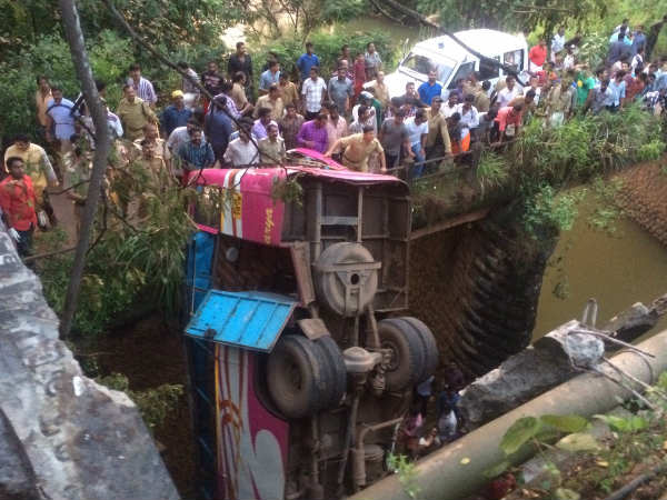 നിയന്ത്രണം വിട്ട് പാലത്തിന്റെ കൈവരി തകര്ത്ത ബസ് പുഴയിലേക്കാണ് ചെന്നു പതിച്ചത്. എന്നാല് പുഴയില് വെള്ളമില്ലാത്ത ഭാഗത്താണ് ബസ് ചെന്നുവീണത്. വെള്ളത്തിലാണ് വീണിരുന്നതെങ്കില് മരണ സംഖ്യ ഇനിയും ഉയരാന് സാധ്യതയുണ്ടായിരുന്നു.