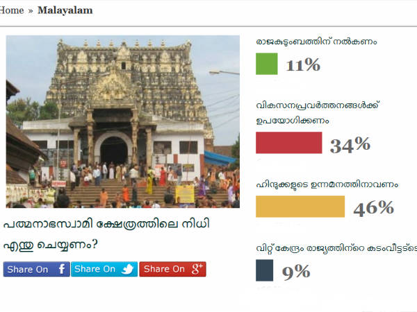 തിരുവനന്തപുരം: ശ്രീ പത്മനാഭസ്വാമി ക്ഷേത്രത്തിലെ നിധി ഹിന്ദുക്കളുടെ ഉന്നമനത്തിന് വേണ്ടി ഉപയോഗിക്കണം എന്ന് സര്വ്വേ. വണ് ഇന്ത്യ നടത്തിയ സര്വ്വേയില് പങ്കെടുത്ത ഭൂരിപക്ഷം പേരും ഇങ്ങനെ ഒരു അഭിപ്രായമാണ് പങ്കുവച്ചിരിക്കുന്നത്.
