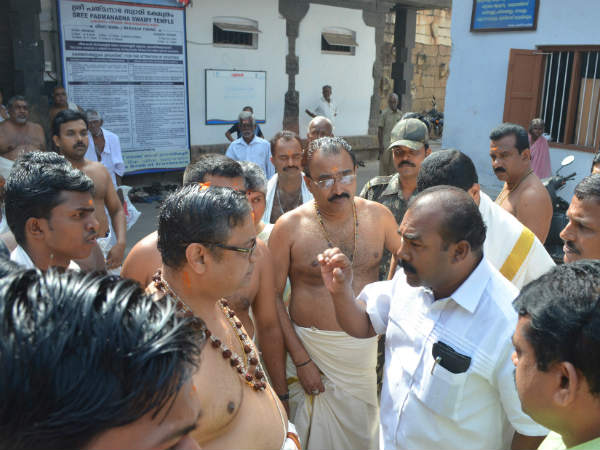 തിരുവനന്തപുരം: പത്മനാഭ സ്വാമി ക്ഷേത്രത്തില് പൂജാരിയെ തടഞ്ഞത് ഉന്നത ഉദ്യാഗോസ്ഥരുടെ നിര്ദ്ദേശ പ്രകാരമാണെന്ന സുരക്ഷാ ഉദ്യോഗസ്ഥരുടെ വിശദീകരണത്തെത്തുടര്ന്ന് ഭക്ത ജനങ്ങളുടെ സംഘടനയും അമിക്കസ് ക്യൂറിയും തര്ക്കത്തിലേര്പ്പെട്ടു. മണിയ്ക്കൂറുകള് നീണ്ട ചര്ച്ചകള്ക്കൊടുവിലാണ് പ്രശ്നങ്ങള് അവസാനിച്ചത്.