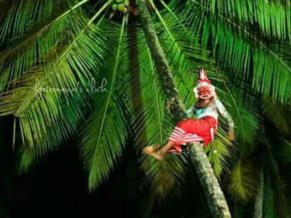വടക്കന് കേരളത്തില് പ്രചാരത്തില് ഉള്ള ബപ്പിരിയന് തെയ്യ വേഷമാണ് സുമേഷ് കെട്ടിയിരുന്നത് ഈ തെയ്യങ്ങള് മരത്തില് വലിഞ്ഞ് കയറും