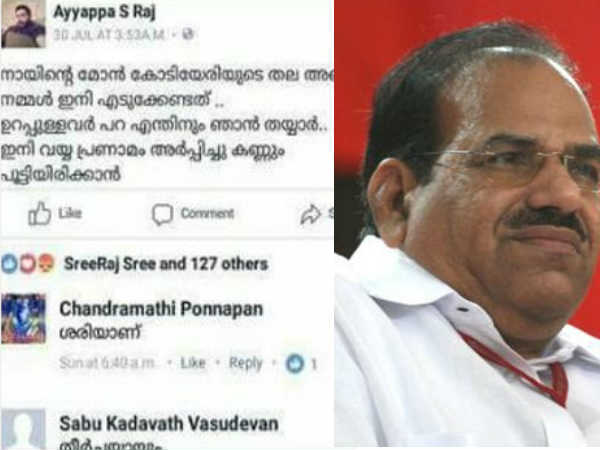 തിരുവനന്തപുരം: തലസ്ഥാനത്ത് കഴിഞ്ഞ കുറേ ദിവസങ്ങളായി നടക്കുന്ന അക്രമപരമ്പരകളുടെ ഭാഗമായെന്നോണം സോഷ്യല് മീഡിയയില് കൊലവിളികള് മുഴങ്ങുകയാണ്. സിപിഎം പ്രവര്ത്തകരും ബിജെപി പ്രവര്ത്തകരും പരസ്പരം വെല്ലുവിളികളും കൊലവിളികളും മുഴക്കുന്നത് പതിവ് കാഴ്ചയാണ്. സിപിഎം സംസ്ഥാന സെക്രട്ടറി കോടിയേരി ബാലകൃഷ്ണനെതിരെ കൊലവിളി മുഴക്കിയ സംഘപരിവാറുകാരന്റെ ഫേസ്ബുക്ക് പോസ്റ്റ് വിവാദത്തിലായിരിക്കുകയാണ്. അയ്യപ്പ എസ് രാജ് എന്ന പേരിലുള്ള അക്കൗണ്ടില് നിന്നാണ് കോടിയേരിക്കെതിരെയുള്ള കൊലവിളി.