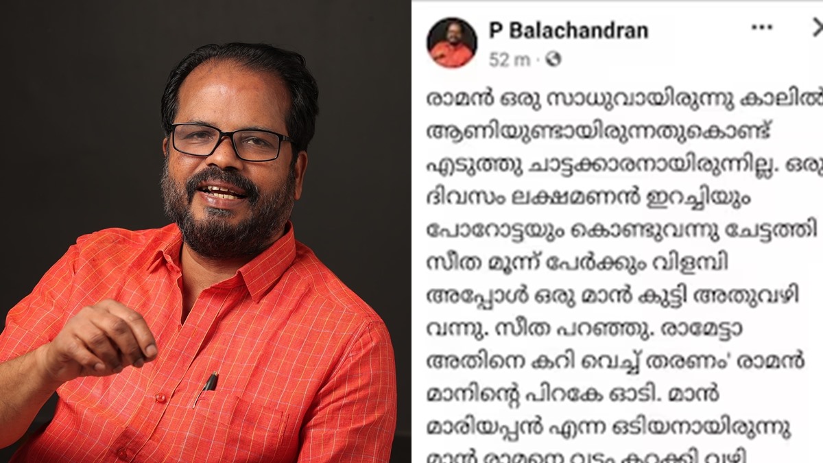 രാമായണത്തിലെ കഥാപാത്രമായ സീത, രാമനും ലക്ഷ്മണനും ഇറച്ചിയും പോറോട്ടയും വിളമ്പി കൊടുത്തു എന്ന ബാലചന്ദ്രന്റെ പോസ്റ്റാണ് വിവാദമായത്. 'രാമന് ഒരു സാധുവായിരുന്നു, കാലില് ആണിയുണ്ടായിരുന്നത് കൊണ്ട് എടുത്തു ചാട്ടക്കാരനായിരുന്നില്ല. ഒരു ദിവസം ലക്ഷ്മണന് ഇറച്ചിയും പോറോട്ടയും കൊണ്ടുവന്നു. ചേട്ടത്തി സീത മൂന്ന് പേര്ക്കും വിളമ്പി, അപ്പോള് ഒരു മാന് കുട്ടി അതുവഴി വന്നു. സീത പറഞ്ഞു. രാമേട്ടാ അതിനെ കറി വെച്ച് തരണം. രാമന് മാനിന്റെ പിറകേ ഓടി. മാന് മാരിയപ്പന് എന്ന ഒടിയനായിരുന്നു. മാന് രാമനെ വട്ടം കറക്കി വഴി തെറ്റിച്ചു നേരം പോയ്. ലക്ഷ്മണന് ഇറച്ചി തിന്ന കൈ നക്കി ഇരിക്കുകയാണ്. സീത പറഞ്ഞു ടാ തെണ്ടി നക്കിയും നോക്കിയും ഇരിക്കാതെ രാമേട്ടനെ പോയ് നോക്ക്. എട്ടും പൊട്ടും തിരിയാത്ത അദ്ദേഹത്തെ കൊണ്ടുവാ'- എന്നിങ്ങനെയാണ് കുറിപ്പിലെ വാചകങ്ങൾ.