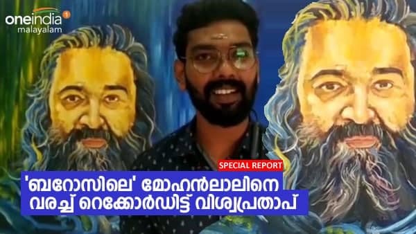 മോഹൻലാൽ ആദ്യമായി സംവിധാനം നിർവഹിക്കുന്ന ചിത്രമാണ് ബറോസ്. സിനിമയില് അദ്ദേഹത്തിന്റെ വേഷപ്പകര്ച്ച കടിച്ചുപിടിച്ച ബ്രഷുപയോഗിച്ചു വരച്ചാണ് മലയിൻകീഴ് സ്വദേശിയായ വി. വിശ്വപ്രതാപ് ശ്രദ്ധ നേടിയത്. ഇതിനാണ് ഇന്ത്യ ബുക്ക് ഓഫ് റെക്കോർഡ് അംഗീകാരവും ലഭിച്ചത്. മൂന്ന് മണിക്കൂർ 28 മിനിട്ട് കൊണ്ട് പൂർത്തിയാക്കിയ ചിത്രം വിശ്വൻ സമൂഹമാധ്യമങ്ങളിൽ പങ്കുവെച്ചിട്ടുണ്ട്.