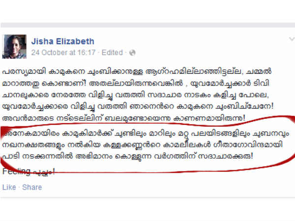 എന്നാല് ഗീതാഗോവിന്ദത്തെ അടിസ്ഥാനമാക്കിയാണ് തന്റെ പോസ്റ്റ് എന്നാണ് ജിഷ പറയുന്നത്. തന്റെ പോസ്റ്റില് ശ്രീകൃഷ്ണനെ കുറിച്ചുള്ള പരാമര്ശങ്ങള്ക്ക് അടിസ്ഥാനമായ ഗീതാഗോവിന്ദത്തിന്റെ പ്രതിപാദ്യ വിഷയം ജിഷ തന്നെ ഫേസിബുക്കില് പോസ്റ്റ് ചെയ്തിട്ടുണ്ട്.