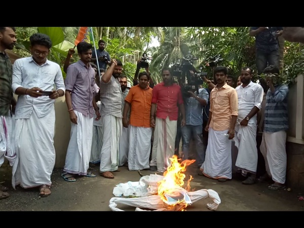 സോളാര് റിപ്പോര്ട്ടില് ഗുരുതര ആരോപണം നേരിട്ട എ.പി അനില്കുമാര് എം.എല്.എ രാജിവെക്കണമെന്നാവശ്യപ്പെട്ട് എംഎല്എ യുടെ വീട്ടിലേക്ക് യുവമോര്ച്ച നടത്തിയ മാര്ച്ചിനെ തുടര്ന്ന് അനില്കുമാറിന്റെ കോലംകത്തിക്കുന്നു.