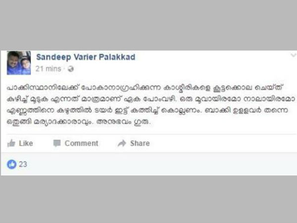 'പാകിസ്താനിലേക്ക് പോകാന് ആഗ്രഹിക്കുന്ന കശ്മീരികളെ കൂട്ടക്കൊല ചെയ്ത് കുഴിച്ചുമൂടുകയാണ് ഏക പോംവഴി. ഒരു മൂവായിരമോ നാലായിരമോ എണ്ണത്തിനെ കഴുത്തില് ടയര് ഇട്ട് കത്തിച്ച് കൊല്ലണം. ബാക്കി ഉള്ളവര് തന്നെ ഒതുങ്ങി മര്യാദക്കാരാവും. അനുഭവം ഗുരു'- ഇതായിരുന്നു സന്ദീപ് വാര്യരുടെ ഫേസ്ബുത്ത് പോസ്റ്റ്.