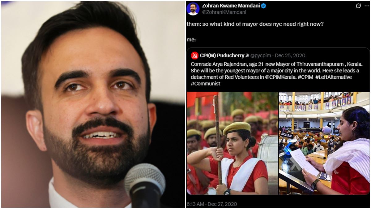 തിരുവനന്തപുരം കോര്പറേഷന് മേയറായി സിപിഎമ്മിലെ ആര്യ രാജേന്ദ്രന് തിരഞ്ഞെടുക്കപ്പെട്ട വേളയില് പുതുച്ചേരി സിപിഎം ഇക്കാര്യം ട്വീറ്റ് ചെയ്തിരുന്നു. ലോകത്തിലെ പ്രായം കുറഞ്ഞ മേയര് ആണ് ആര്യ എന്ന് സൂചിപ്പിക്കുന്ന ഈ ട്വീറ്റ്, 2020 ഡിസംബര് 27ന് മംദാനി പങ്കുവയ്ക്കുകയുണ്ടായി. എങ്ങനെയുള്ള മേയറെയാണ് ന്യൂയോര്ക്കിന് ഇപ്പോള് ആവശ്യം എന്ന ചോദ്യത്തോടെയാണ് മംദാനി ആര്യയുടെ ചിത്രം പങ്കുവച്ചത്.
