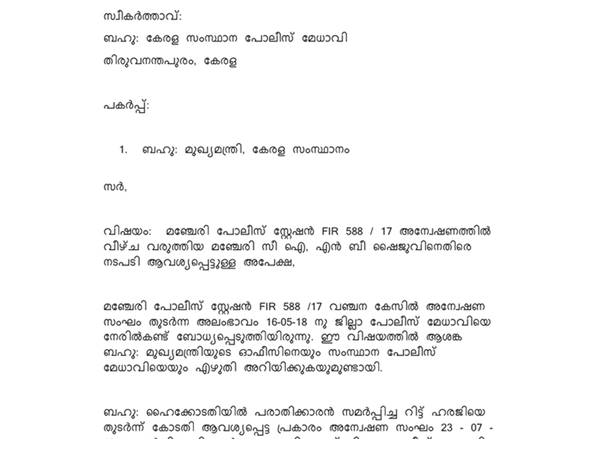 പോലീസ് റിപ്പോര്ട്ട് സത്യം മൂടിവെച്ചുകൊണ്ടും ഊഹങ്ങള് ഉള്പ്പെടുത്തിക്കൊണ്ടും കുറ്റാരോപിതന്റെ മൊഴികള് തെളിവുകള് നോക്കാതെ അംഗീകരിച്ചുകൊണ്ടമാണെന്നും ഇതിനെ തുടര്ന്ന് താന് ഹൈക്കോടതിയില് റിട്ട് ഹര്ജി ഫയല്ചെയ്തതെന്നും പരാതിക്കാരന് ആരോപിക്കുന്നു. കേസില് അന്വേഷണോദ്യോഗസ്ഥനായ എന്.ബി ഷൈജു സ്വാധീനങ്ങള്ക്ക് വഴങ്ങി റിപ്പോര്ട്ടില് വരുത്തിയ ക്രമക്കേടുകള് ഉയര്ന്ന പോലീസ് മേധാവികളുടെ പരിശോധനക്ക് വിധേയമാക്കി നടപടി സ്വീകരിക്കണമെന്നും പരാതിയില് പറയുന്നു.