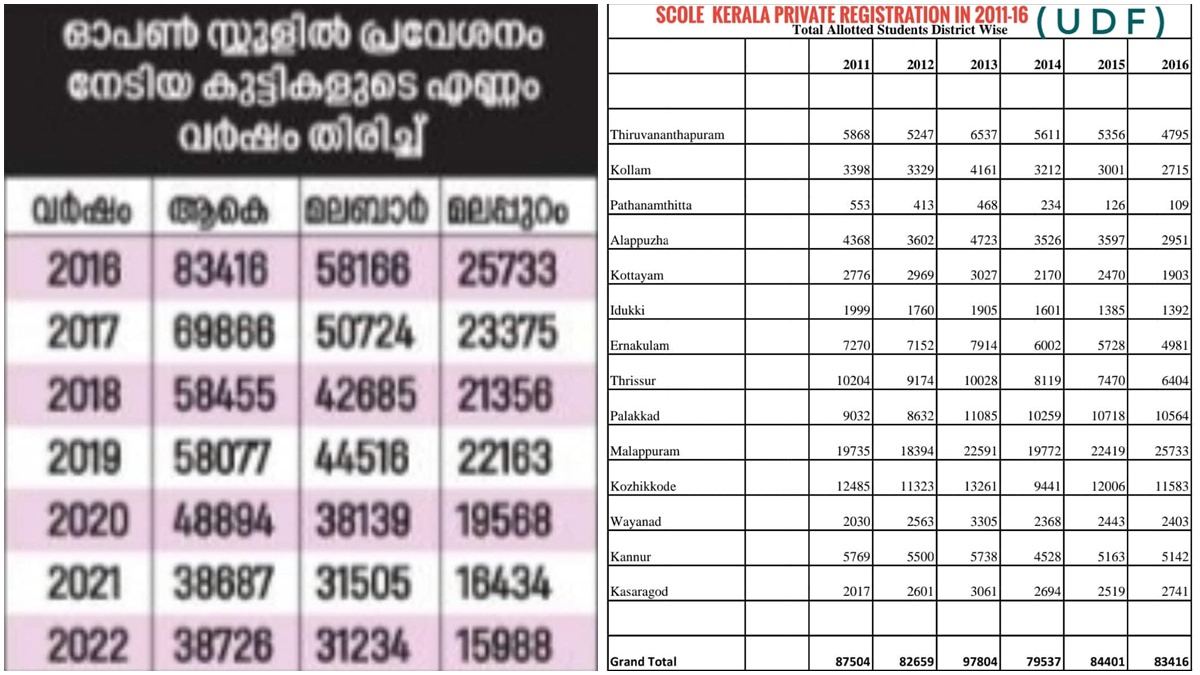 2011 ൽ വി.എസ് അച്ചുതാനന്ദൻ നേതൃത്വം നൽകിയ ഭരണം അവസാനിക്കുമ്പോൾ മലപ്പുറം ജില്ലയിൽ സ്കോൾ കേരളയിൽ റജിസ്റ്റർ ചെയ്ത കുട്ടികളുടെ എണ്ണം 19,735 ആയിരുന്നു. UDF ഭരിച്ച് അഞ്ച് വർഷം പൂർത്തിയാക്കിയ 2016 ൽ അത് 25,733 ആയി ഉയർന്നു. ഇടതു ഭരണം 6 വർഷം പൂർത്തിയാക്കിയ 2022 ൽ സ്കോൾ കേരളയിൽ പ്രൈവറ്റായി റജിസ്റ്റർ ചെയ്ത കുട്ടികളുടെ എണ്ണം 15,988 ആയി വീണ്ടും താഴ്ന്നു.
