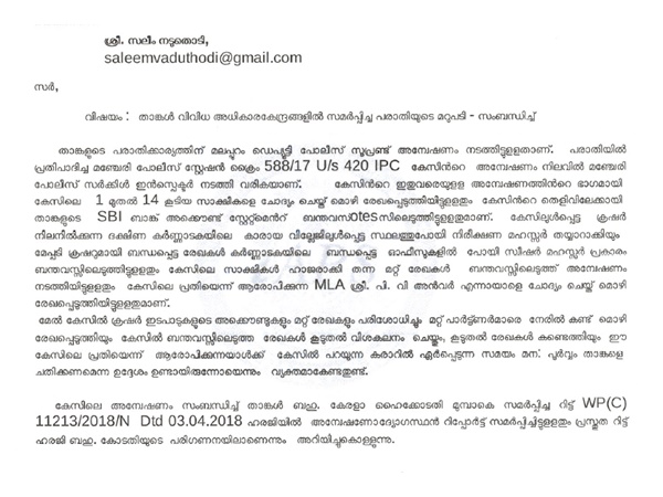 ഇതിനുപുറമെ കേസ് നീട്ടിക്കൊണ്ടുപോകുന്നതായി ചൂണ്ടിക്കാണിച്ച് ഹൈക്കോടതിയെയും പരാതിക്കാരന് സമീപിച്ചിരുന്നു. ഇതില് സലീമിന്റെ വാദംകേട്ട ശേഷം കഴിഞ്ഞ ദിവസം പ്രോസിക്യൂഷനോട് കേസ് ഡയറി ഹാജരാക്കാനും ഹൈക്കോടതി നിര്ദ്ദേശിച്ചു. നിലവില് മഞ്ചേരി സി.ഐ കേസ് അന്വേഷിച്ചുവരികയാണെന്നും ഇതുവരെ കേസിലെ 14സാക്ഷികളുടെ മൊഴികള് പോലീസ് രേഖപ്പെടുത്തിയതായും പരാതിക്കാരന് പോലീസ് നല്കിയ മറുപടിയില് പറയുന്നു. കേസില് ഉള്പ്പെട്ട ക്രഷര് നിലനില്ക്കുന്ന ദക്ഷിണ കര്ണാടകയിലെ ബന്ധപ്പെട്ട ഓഫീസുകളില് പോയി പോലീസ് അന്വേഷണം നടത്തിയെന്നും തുടര്ന്നു എം.എല്.എയെ ചോദ്യംചെയ്തൂവെന്നും പോലീസിന്റെ മറുപടിക്കുറിപ്പിലുണ്ട്.