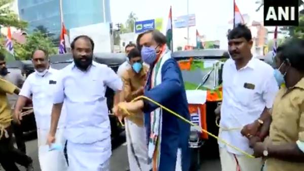 ഇന്ധനവില വര്ദ്ധന: തിരുവനന്തപുരത്ത് ഓട്ടോറിക്ഷ കെട്ടിവലിച്ച് വേറിട്ട പ്രതിഷേധവുമായി ശശി തരൂര്