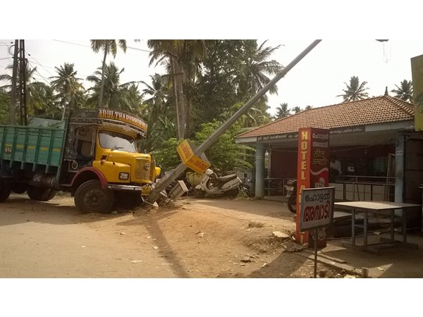 ലോറിയുടെ വേഗതക്ക് ഒട്ടും കുറക്കാൻ കഴിയാതെ വന്നതോടെ മുന്നിലെ ബസിലെ യാത്രക്കാരെ എങ്ങനെയും രക്ഷിക്കണമെന്നായി. പെട്ടെന്നാണ് റോഡിന് ഇടത് വശത്തേക്ക് ലോറിയെ വെട്ടിത്തിരിച്ചത്. റോഡിന് ഇടത് വശത്തായി നിന്ന ഹൈ മാസ്റ്റ് ലൈറ്റിൽ ഇടിച്ച ലോറി ലൈറ്റ് സ്ഥാപിച്ചിരിക്കുന്ന കോൺക്രീറ്റിലെ തൂണിൽ ഇടിച്ചാണ് നിന്നത്.പഞ്ചായത്ത് സ്ഥാപിച്ചിരുന്ന ഹൈ ലൈറ്റ് തകർന്നു എങ്കിലും ബസിലെ യാത്രക്കാരെ രക്ഷിക്കാൻ കഴിഞ്ഞ ആശ്വാസത്തിലാണ് ലോറിയുടെ ഉടമയും ഡ്രൈവറും.