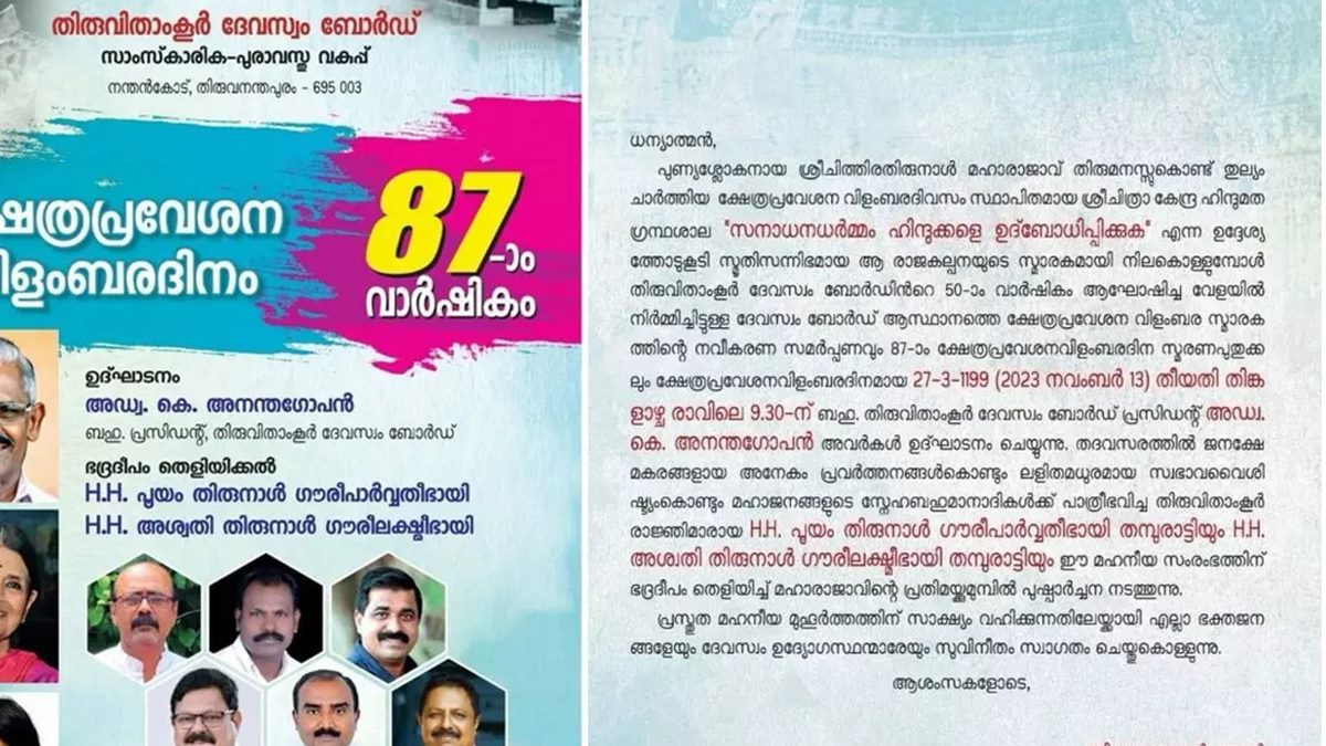 നോട്ടീസ് വലിയ രീതിയിൽ വിമർശിക്കപ്പെട്ടു. തിങ്കളാഴ്ച നന്തൻകോടുള്ള ദേവസ്വം ബോർഡ് ആസ്ഥാനത്താണ് പരിപാടി നടക്കുന്നത്. തിരുവിതാംകൂർ ദേവസ്വം ബോർഡ് പ്രസിഡന്റ് അഡ്വ. കെ അനന്ത ഗോപനാണ് പരിപാട് ഉദ്ഘാടനം ചെയ്യുന്നത്.