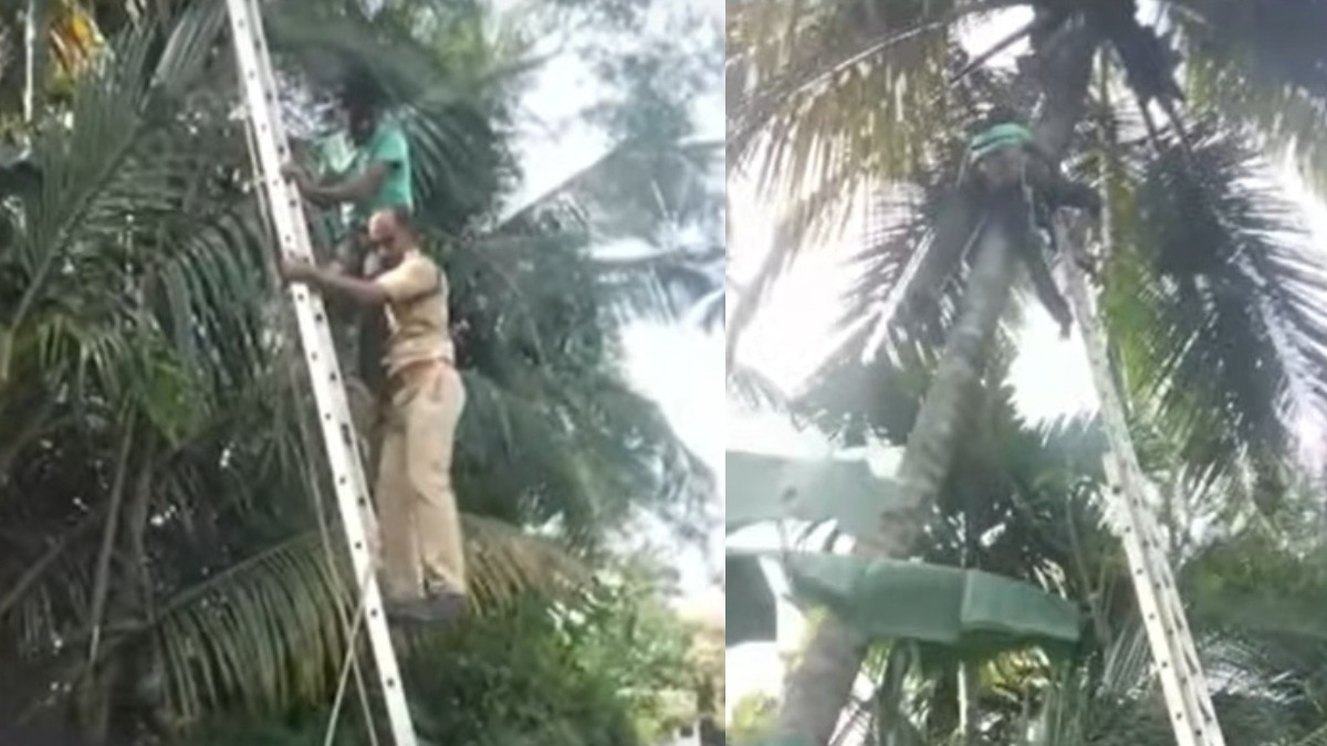 തെങ്ങിൽ കയറുന്നതിനിടെ പിടുത്തംവിട്ടു; 42 അടി ഉയരത്തിൽ തലകീഴായി യുവാവ്, പിന്നീട് സംഭവിച്ചത്