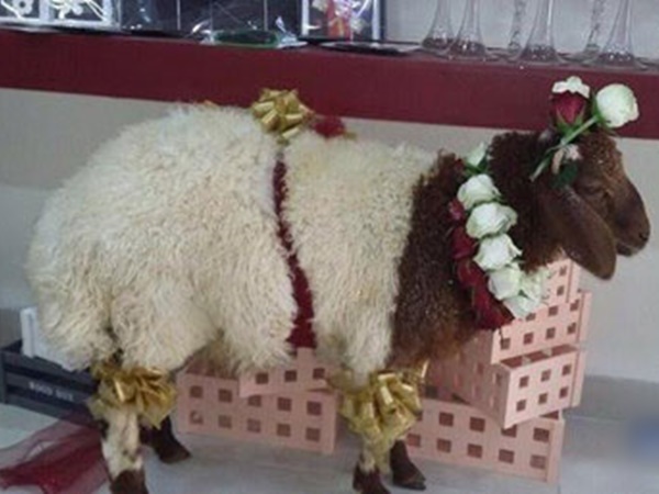 കടയില് നിന്നും ഒരു ചെമ്മരിയാടിനെ വാങ്ങി കൊണ്ടുപോയത് ഫാന്സി ഷോപ്പിലേക്കാണ്. കഴുത്തില് റോസാപൂ മാലയും കാലുകളില് സ്വര്ണ നിറത്തിലുള്ള റിബണുകളും കെട്ടി അണിഞ്ഞൊരുങ്ങി നില്ക്കുന്ന ഈ സുന്ദരിയെ കാണൂ...