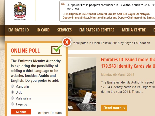 യുഎഇ സര്ക്കാര് വെബ്സൈറ്റിന്റെ ഓണ്ലൈന് വോട്ടെടുപ്പില് മലയാളവും