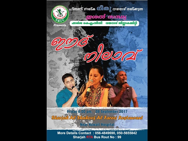സിനിമ പിന്നണി ഗായിക നീതു വയനാട് നയിക്കുന്ന ഇശല് വിരുന്നും, യു എ ഇ യിലുള്ള വയനാട്ടിലെ ചെറു കിട സംരംഭകരേയും , കല , സാംസ്കാരിക രംഗത്തെ പ്രമുഖരെയും ചടങ്ങില് ആദരിക്കുമെന്നും ഭാരവാഹികള് അറിയിച്ചു . ബന്ധപ്പെടേണ്ട നമ്പര് : 0564849690, 050-5655842