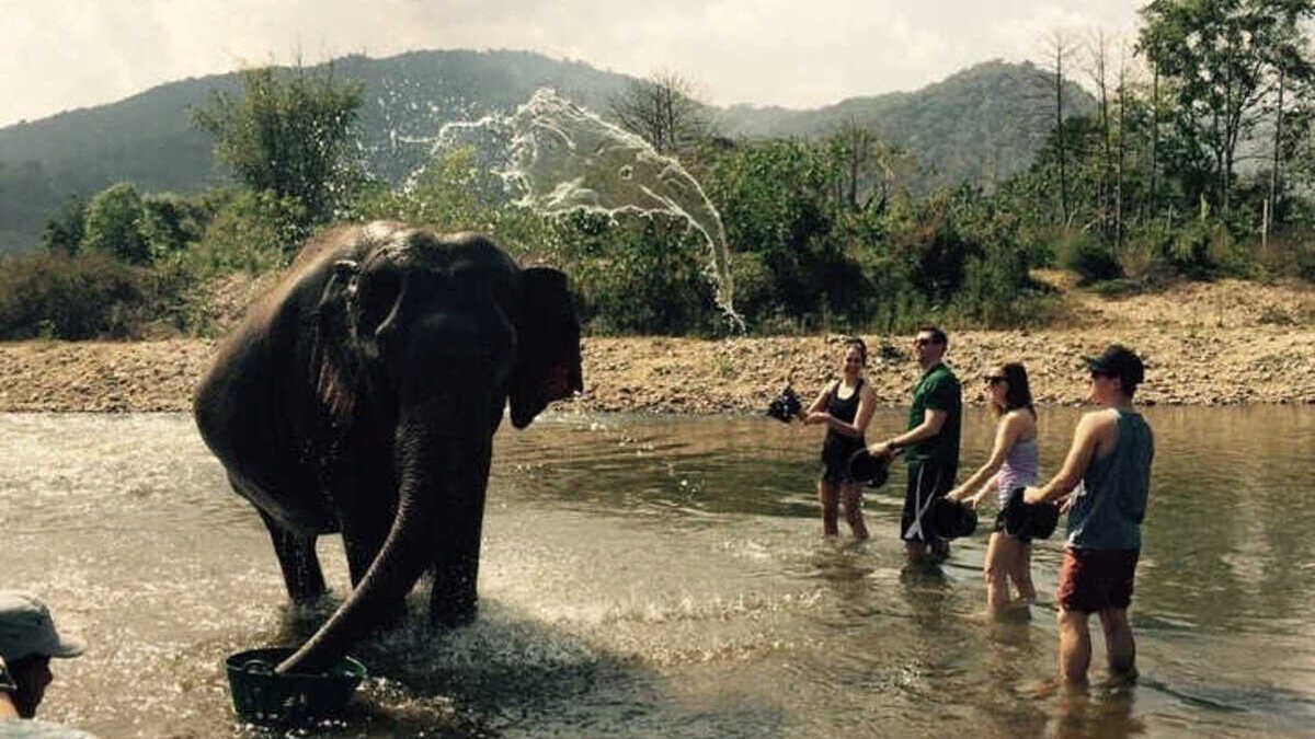 നമ്മുടെ മുന്നിലുള്ള ചിത്രം വളരെ കിടിലനാണ്. ഒന്ന് നോക്കൂ അവിടേക്ക് നോക്കൂ. ഒരു പുഴയല്ലേ കാണുന്നത്. അവിടെ ഒരു ആനയും ഉണ്ടല്ലോ. കുറേ വിദേശികള് ചേര്ന്ന് ഒരു ആനയെ കുളിപ്പിക്കുകയാണ്. പുഴയിലെ വെള്ളം എടുത്താണ് കുളിപ്പിക്കുന്നത്.
