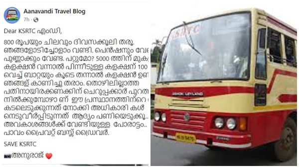 കെഎസ്ആര്ടിസി എംഡിയെ അഭിസംബോധന ചെയ്തുള്ള കുറിപ്പാണ് സ്വകാര്യ ബസ് ജീവനക്കാരന് പങ്കുവച്ചിരിക്കുന്നത്. 800 രൂപയും ചെലവും ദിവസക്കൂലിയായി തരൂ എന്നാണ് കുറിപ്പില് പറയുന്നത്. ബസ് ഞങ്ങള് ഓടിക്കാം. പെന്ഷന് വേണ്ട. 5000ത്തിന് മുകളില് കളക്ഷന് വന്നാല് നൂറ് രൂപയ്ക്ക് അഞ്ച് രൂപ എന്ന രീതിയില് ബാറ്റയും വേണമെന്നും കുറിപ്പില് ആവശ്യപ്പെടുന്നു.