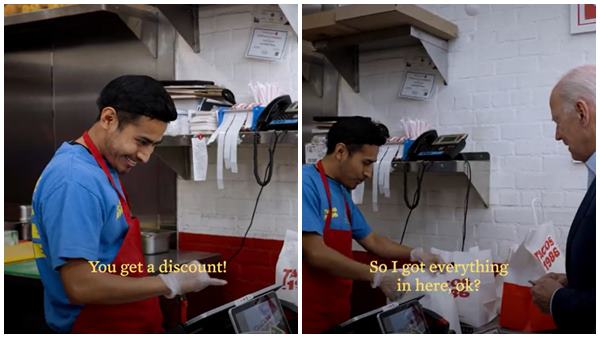 ബൈഡനായി 50 ശതമാനം ഡിസ്കൗണ്ടുണ്ട് എന്ന് ക്യാഷിയര് പറയുന്നു. നിങ്ങളുടെ പൊതുസേവനത്തിനാണ് ഇത്രയും ഡിസ്കൗണ്ട് എന്നും യുവാവ് പറയുന്നുണ്ട്. 16.45 ഡോളറാണ് ബൈഡന് ആകെ ചെലവായത്. എന്നാല് ബൈഡന് ഇയാള്ക്ക് നല്കിയത് 60 ഡോളറാണ്. ബാക്കിയുള്ള പണം കൊണ്ട് അടുത്ത ഓര്ഡറുമായി വരുന്നയാള്ക്ക് സൗജന്യമായി സാധനങ്ങള് നല്കണമെന്നും ബൈഡന് ഇയാളോട് നിര്ദേശിച്ചിട്ടുണ്ട്. എന്താണ് വാങ്ങിയതെന്ന് ഈ വീഡിയോയില് ചോദിക്കുന്നുണ്ട്. താന് ചിക്കന് ക്യൂസാഡില്ലയാണ് വാങ്ങിയതെന്നും ബൈഡന് മറുപടി നല്കി.