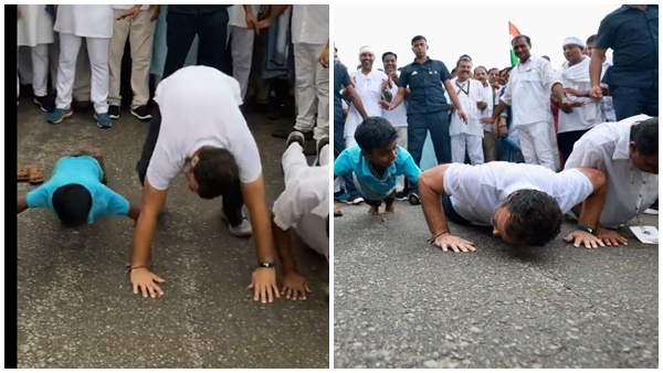 ഇതോടെയാണ് പുഷ് അപ്പിലേക്ക് എത്തിയത്. രാഹുലും ശിവകുമാറും വേണുഗോപാലും റോഡില് വച്ചു തന്നെ പുഷ് അപ്പ് എടുക്കുകയായിരുന്ന. ഈ വീഡിയോ ആണ് സോഷ്യല് മീഡിയ ഇപ്പോള് വൈറലാക്കിയിരിക്കുന്നത്. രാഹുലിന്റെ പുഷ് അപ്പ് ആണ് പെര്ഫെക്ട് എന്നാണ് കമന്റുകള്. ഇതാദ്യമായല്ല ആള്ക്കൂട്ടത്തിന് നടുവില് വെച്ച് രാഹുല് പുഷ് അപ്പ് എടുത്ത് താരമാകുന്നത്. ഇതിന് മുമ്പും രാഹുലിന്റെ ഒരു പുഷ് അപ്പ് വൈറലായിരുന്നു.
