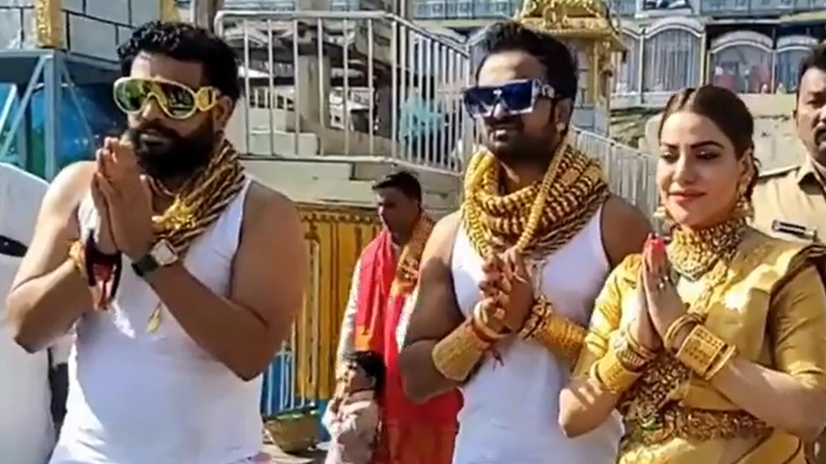 നാലംഗ കുടുംബം കൂപ്പുകൈകളുമായി നില്ക്കുന്നതാണ് വീഡിയോയിലുള്ളത്. കഴുത്തില് കട്ടിയുള്ള ചങ്ങലയുമായി വെള്ള വസ്ത്രവും ധോത്തിയും ധരിച്ച രണ്ട് പുരുഷന്മാരും സ്വര്ണ്ണ നിറത്തിലുള്ള സാരി ധരിച്ച ഒരു സ്ത്രീയും ആഭരണങ്ങളാല് പൊതിഞ്ഞാണ് ക്ഷേത്രത്തിലെത്തിയത്. സംഭവത്തിന്റെ വീഡിയോ ഇതിനോടകം സോഷ്യല് മീഡിയയില് വൈറലായിട്ടുണ്ട്. ഇവര്ക്കെതിരെ സോഷ്യല് മീഡിയ വലിയ വിമര്ശനവും ഉയരുന്നുണ്ട്.